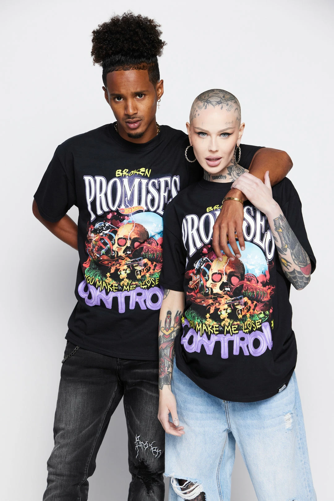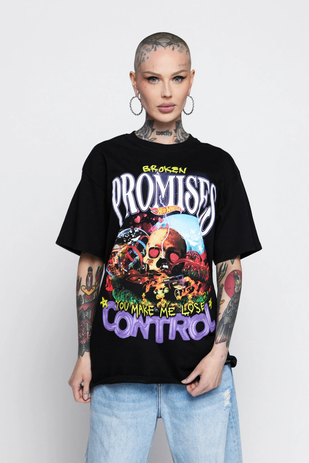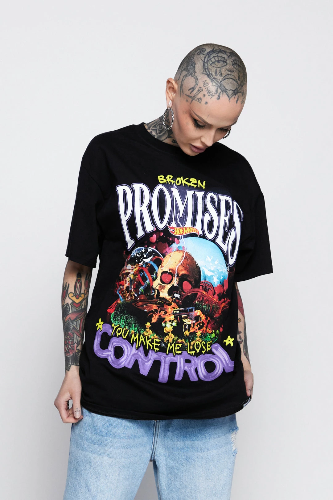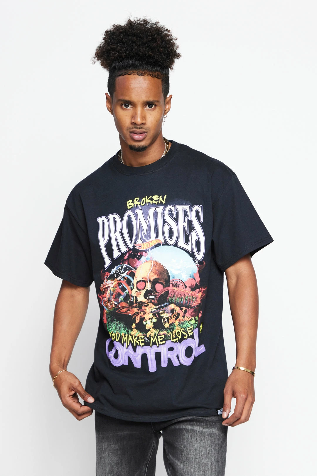 - Graphic features a Hot Wheels track with skull and scenic background, with the phrase “You make me lose control” in a combination of hand-written and balloon letters.Â