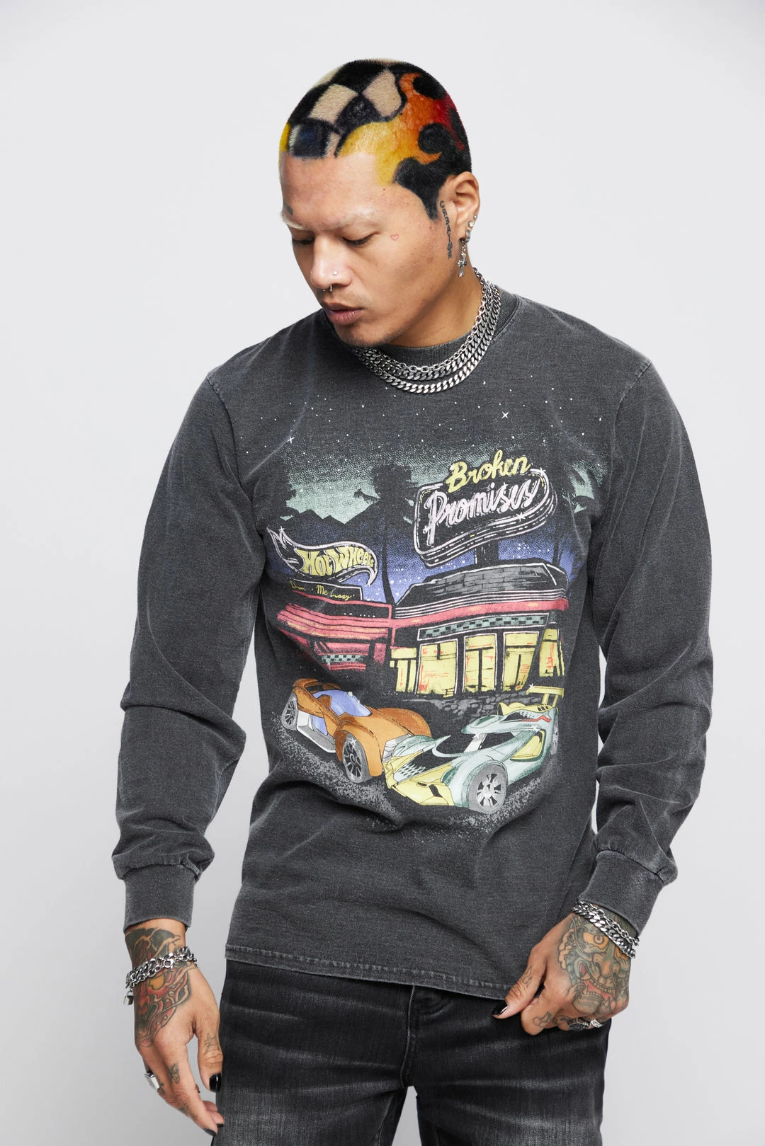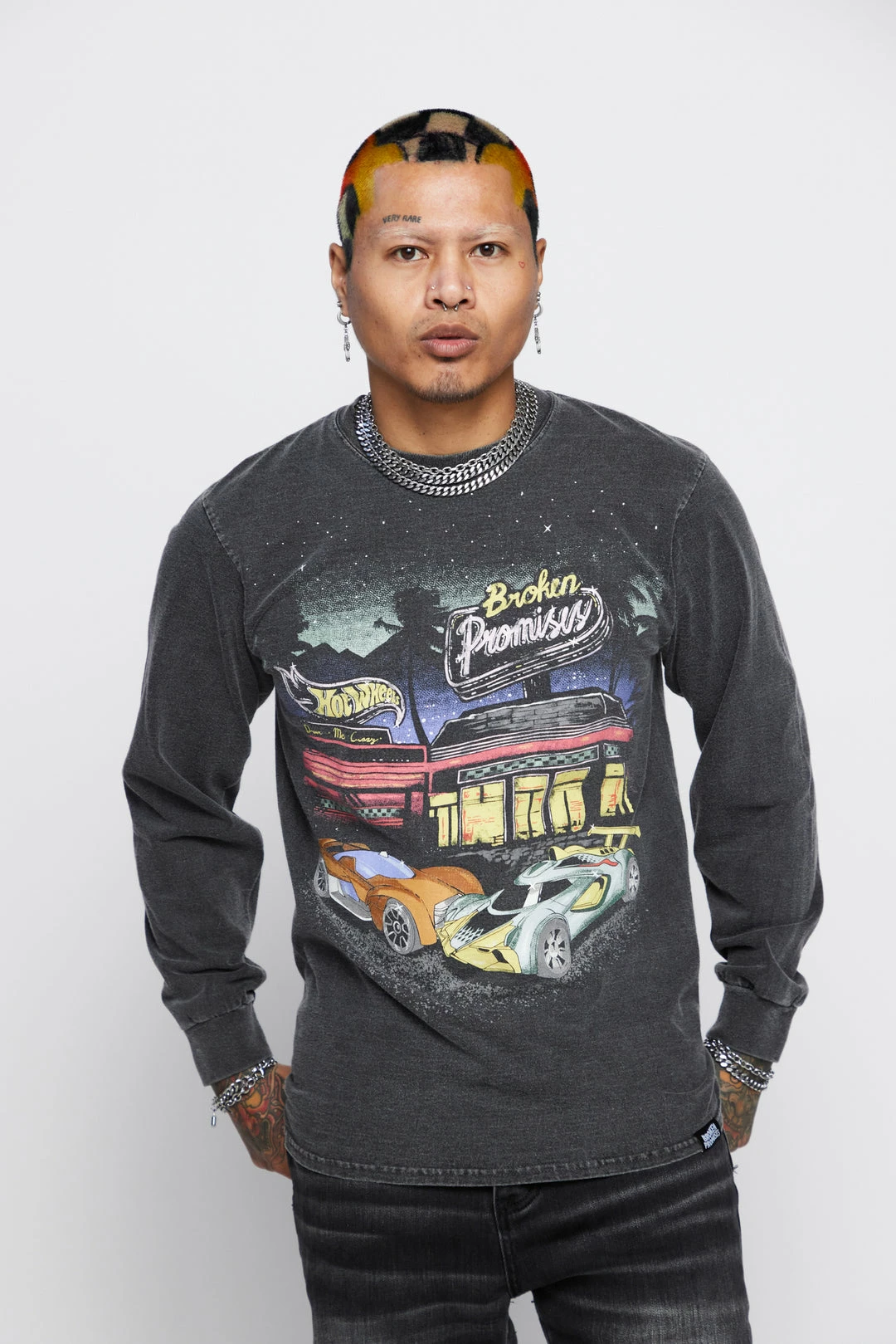 - Front features a vintage-inspired diner with Hot Wheels die-casts and Broken Promises and Hot Wheels logos in neon signs. The back features a retro motel-style sign with the phrase “Look both ways before you drive me crazy”.