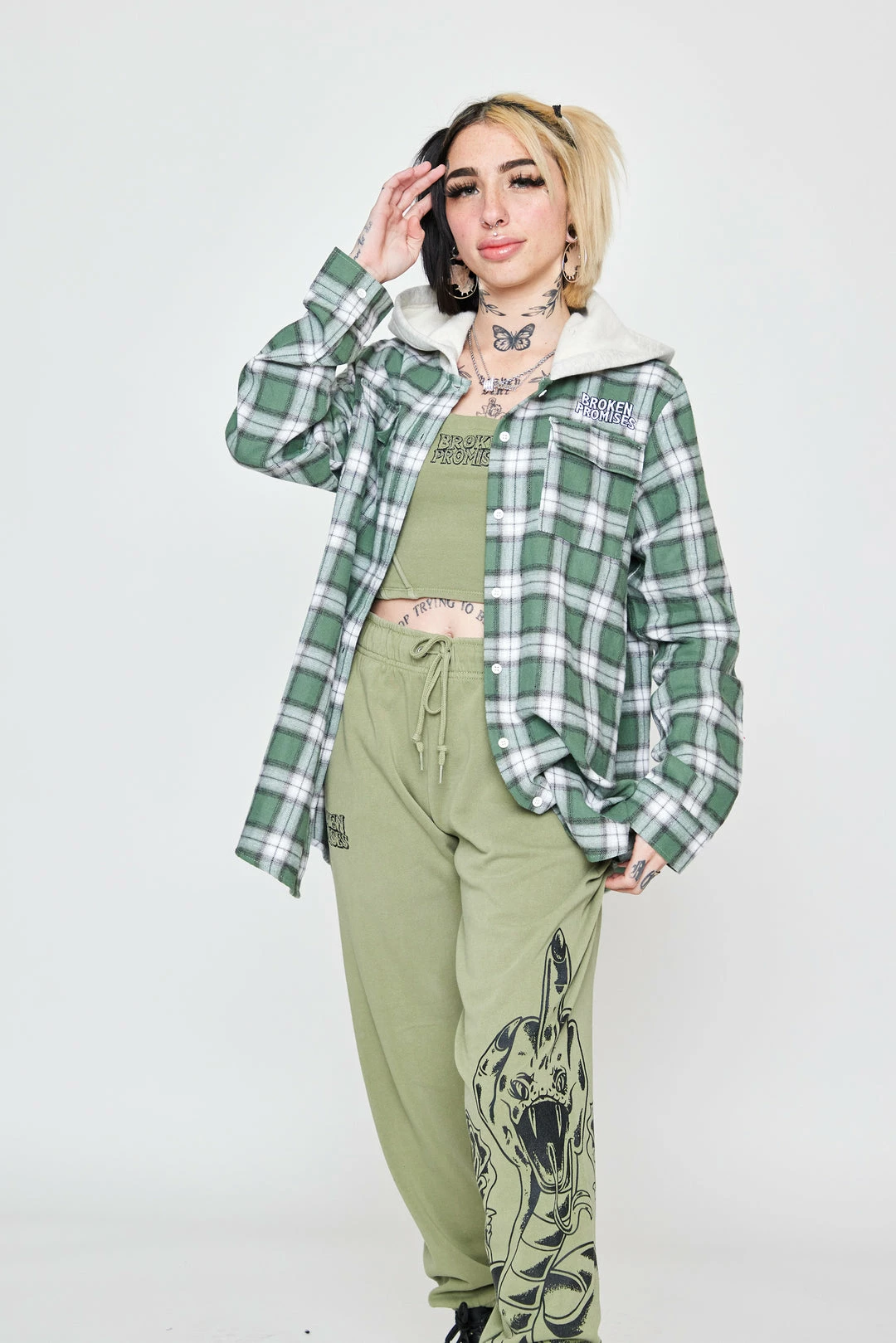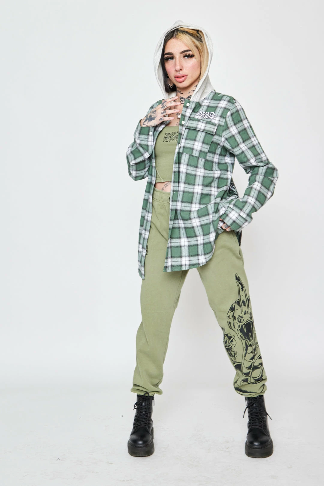 - Green and grey plaid pattern throughout.