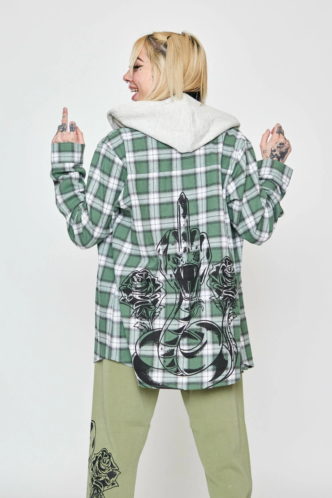 - Screen-printed serpent with a middle finger for a head on shirt’s back.