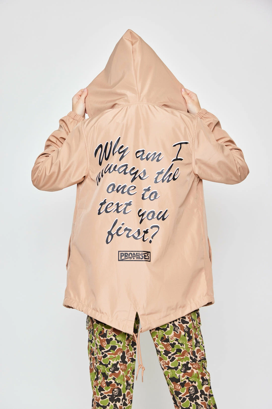 - Screen-printed logo script on left chest and, on the back, script that reads “Why am I always the one to text you first?”