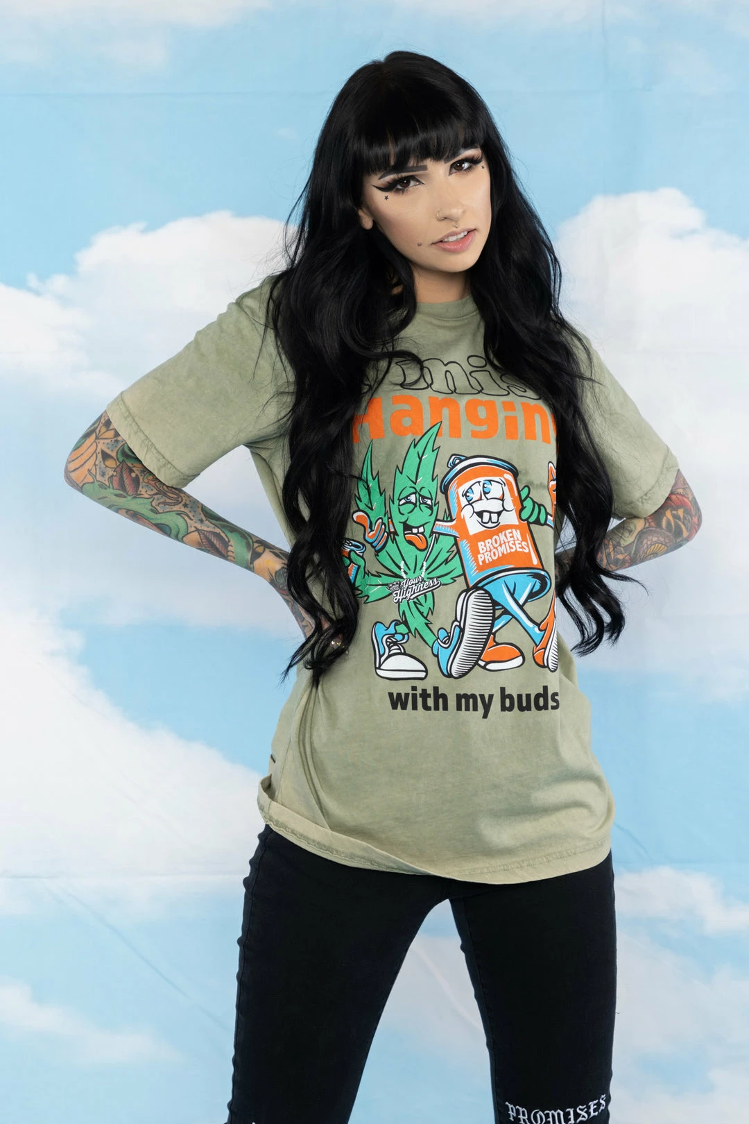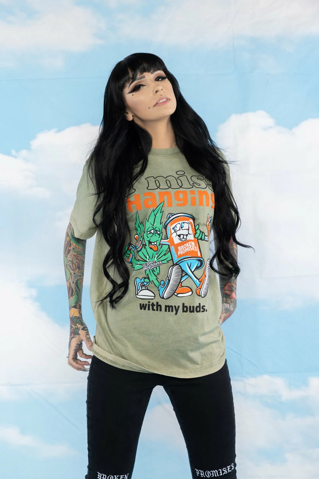 BROKEN PROMISES With My Buds Mineral Wash Olive Tee – BPxYH