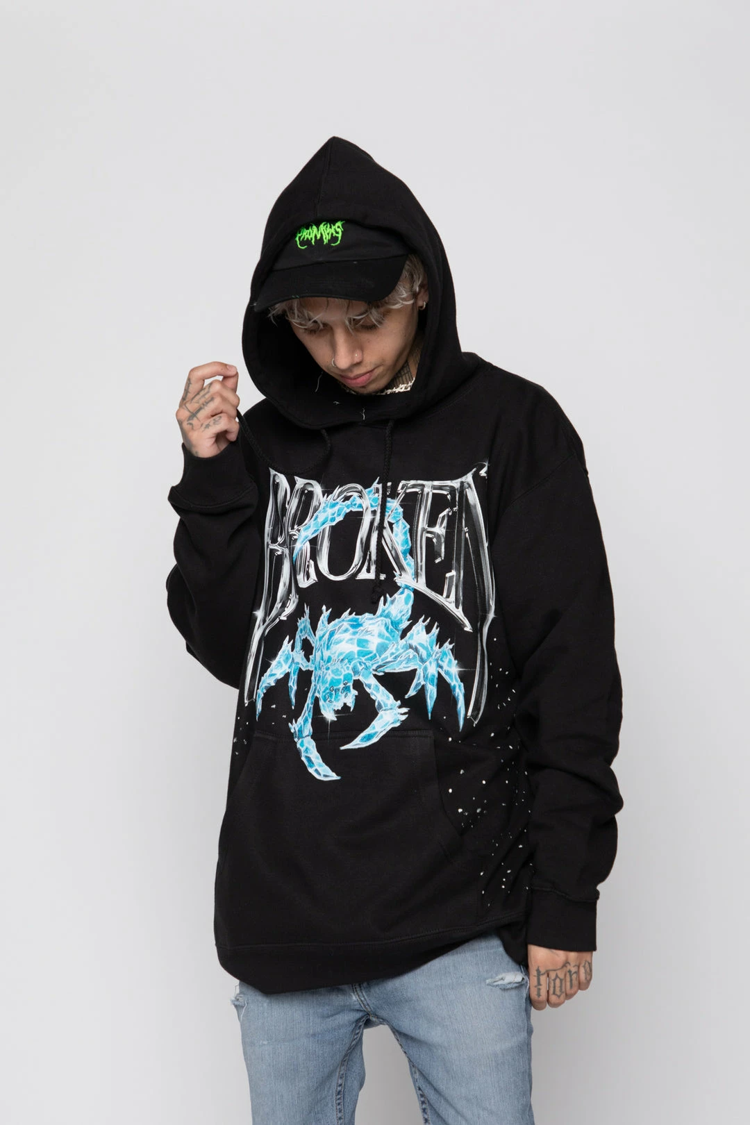 - Hoodie with hand-spattered “snow” screen print ink on front and back